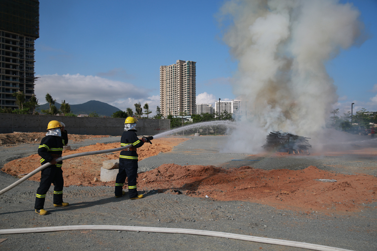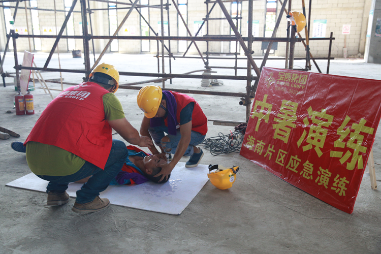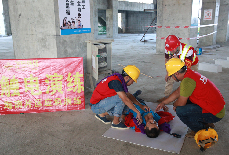 在綜合應(yīng)急演練中,演練人員分別模擬了高空墜落、觸電、中暑、火災(zāi)等工地常見的突發(fā)安全事件。在觸電事件發(fā)生后,演練人員按照正確的自救方法對(duì)傷員進(jìn)行救治,迅速報(bào)告項(xiàng)目安全人員,并撥打120急救熱線,封鎖事件現(xiàn)場(chǎng),待120專業(yè)救助人員前來(lái)救治。高空墜落、中暑和火災(zāi)各演練亦遵循其各自的特點(diǎn),在模擬實(shí)戰(zhàn)中為觀摩人員獻(xiàn)上豐富的一課。值得一提的是在滅火演練中,清水灣消防官兵不僅親自上陣為觀摩者示范消防設(shè)備的使用方法,還出動(dòng)了消防車以增強(qiáng)演練的真實(shí)感。
