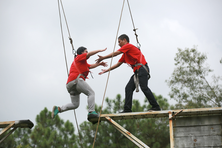 高空挑戰(zhàn)項(xiàng)目旨在通過(guò)完成8米高空中的斷橋跨越,讓學(xué)員學(xué)會(huì)克服內(nèi)心恐懼,深化對(duì)自己的認(rèn)識(shí),激發(fā)自身潛力,突破自我極限,并學(xué)會(huì)相信他人,感受來(lái)自團(tuán)隊(duì)的鼓勵(lì)。