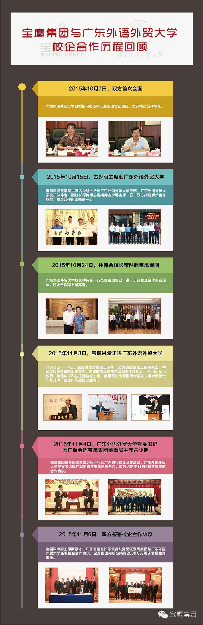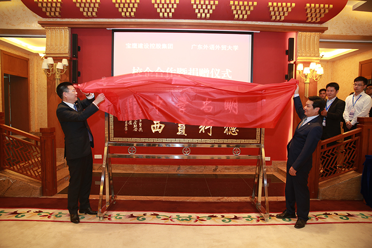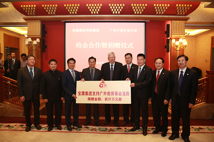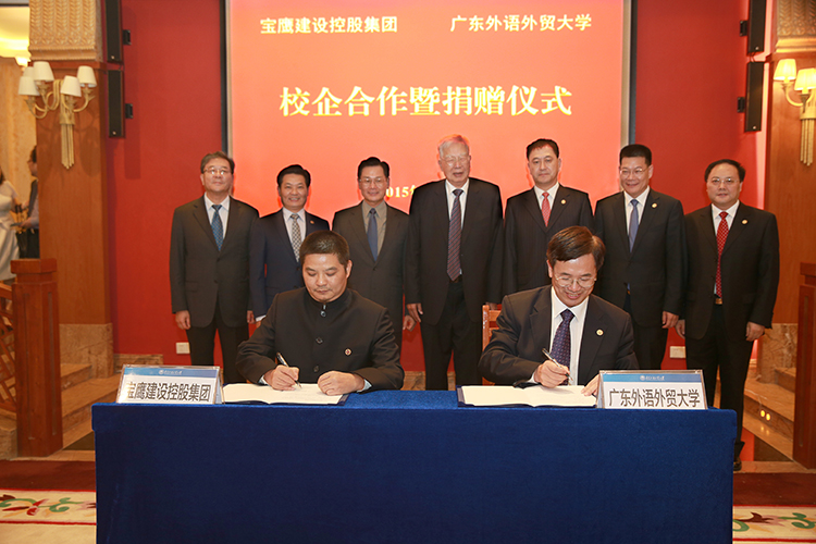 2015年11月6日,廣東外語外貿大學50周年校慶之際,按照此前寶鷹集團與廣東外語外貿大學多次洽談后形成的既定時間表,雙方正式在廣東外語外貿大學行政樓貴賓廳舉辦校企合作簽約儀式。