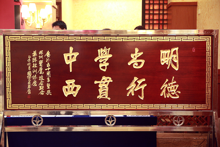 雙方致辭后,為表達對廣外建校50周年的祝福,寶鷹集團董事局主席古少明向校方贈送由廣州美術家協會主席周國城書寫的“明德尚行、學貫中西”(廣外校訓)牌匾,以此作為賀禮,向廣外建校50周年來培育出一代又一代學貫中西人才的杰出成果致敬。