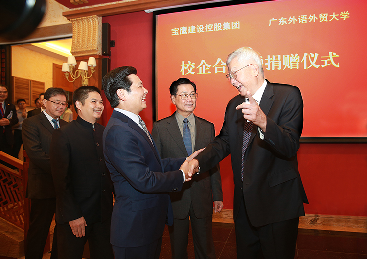 簽約儀式后,古少明主席代表寶鷹實業集團向廣東外語外貿大學捐贈人民幣2000萬元,用于發展廣東外語外貿大學教育事業。