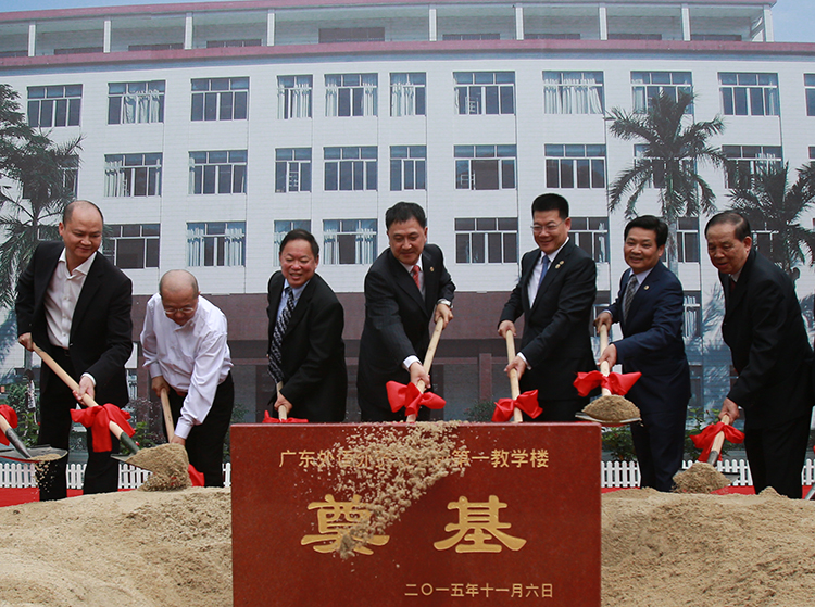 ▲廣外黨委書記隋廣軍(中)、校長仲偉合(右三)、寶鷹集團董事局主席古少明(右二)、原云浮市委書記溫耀深(右一)、匯林金屬集團董事長李軍(左一)、美國天橋集團董事長喬欣(左三)共同揮鏟為廣外第一教學樓奠基