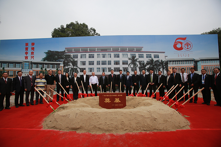 隨后,古少明主席與廣東外語外貿大學黨委書記隋廣軍、校長仲偉合等校領導及廣外校友一起,為廣外第一教學樓重建培土奠基。