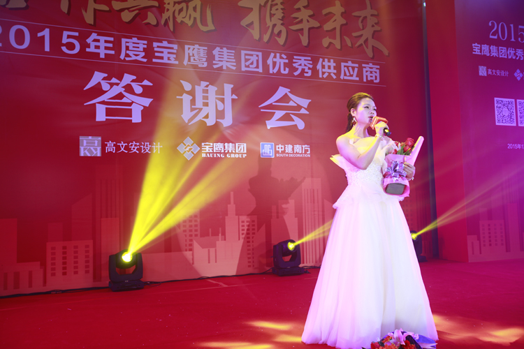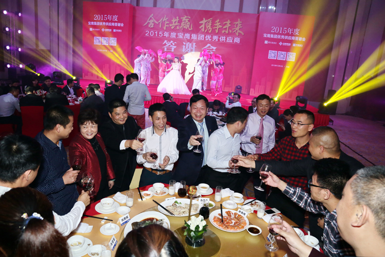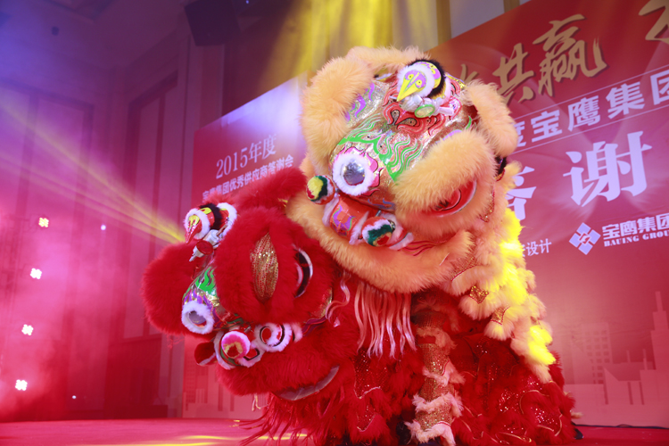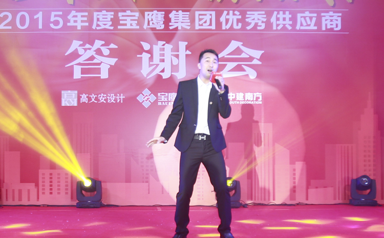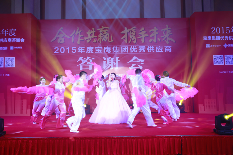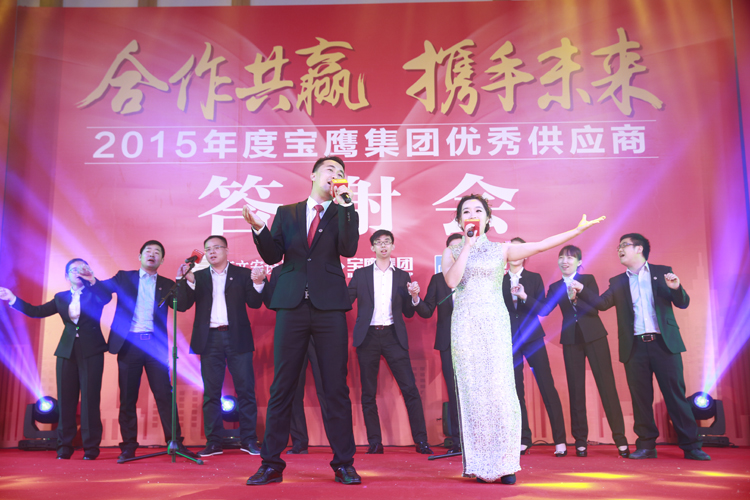 在諸位供應商與三方領導一起舉杯,滿飲此杯時,2015寶鷹集團優秀供應商答謝會晚宴正式開始。一曲曲深情的歌兒唱出溫馨的祝福,一支支優美的舞蹈跳出一個前程錦繡。熱鬧非凡的舞獅表演象征著紅紅火火,《今宵如此美麗》的曼妙歌聲讓諸位嘉賓流連忘返,《相親相愛的一家人》訴說著濃濃的情意,《大展宏圖》則傳遞出對未來的雄心壯志。參會嘉賓與諸位領導一邊觀賞著精彩的節目,一邊為友誼和新的希望舉杯,現場沉浸在一派活潑熱鬧的氣氛中。值得一提的是,本次供應商答謝會加入了嘉賓點歌環節,諸位嘉賓分別用歌唱表達著自己心中的喜悅,亦為此次供應商答謝會畫上了圓滿的句號。