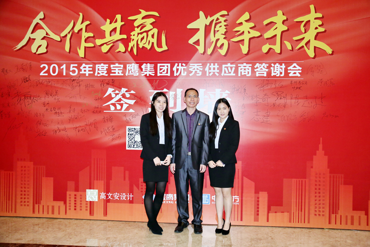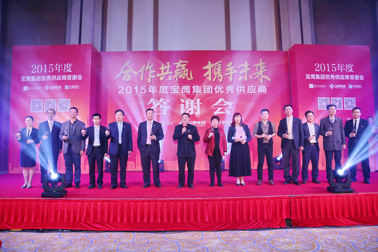 答謝會上,寶鷹集團總裁成湘文對各位優秀供應商代表的到來表示熱烈歡迎,并向在2015年對寶鷹集團、中建南方和高文安設計的事業給予莫大支持和幫助的各位朋友表示衷心的感謝。成湘文總裁說:寶鷹集團在2015年里延續2014年的穩健步伐,在提升主營業務的同時不斷打開格局,以更積極的姿態踐行“互聯網+”戰略和“一帶一路”戰略。2015年,寶鷹集團順勢而為,成功牽手全球知名室內設計品牌——高文安設計,打響了“以設計帶動施工”發展戰略。2015年,寶鷹集團把握大勢,果敢入股二維碼行業領導者——武漢矽感,再次深耕“互聯網+”行業。2015年,寶鷹集團文化開路,奮翅海外,在“一帶一路”上愈行愈遠。斐然的成績離不開集團領導班子的正確決策,離不開每一位寶鷹人的不竭努力,更離不開各位供應商對寶鷹集團日繼一日的大力支持。我們未來還有著更廣闊的合作深度和合作層次,寶鷹集團將一直堅持誠信經營,共贏經商的合作理念,高度重視合作伙伴利益,在新時代下繼續引領行業,創造輝煌。