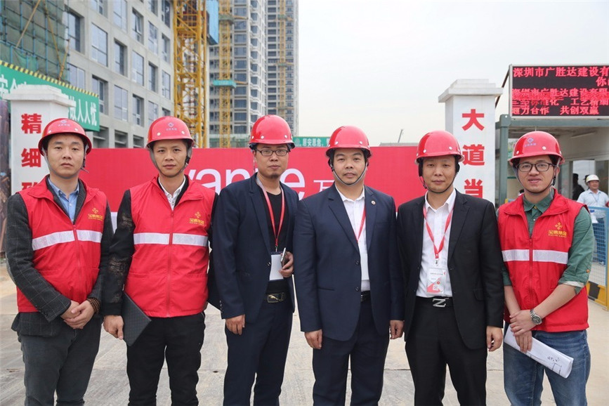 ▲董事長(zhǎng)古少波(右三)與寶鷹集團(tuán)萬(wàn)科云城項(xiàng)目部員工在萬(wàn)科云城項(xiàng)目現(xiàn)場(chǎng)