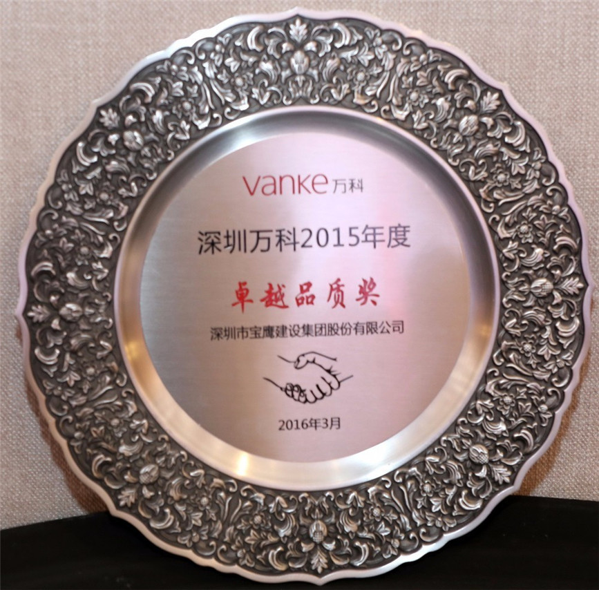 ▲寶鷹集團(tuán)獲得深圳萬(wàn)科2015年度卓越品質(zhì)獎(jiǎng)(上圖中為工程四部負(fù)責(zé)人陳東才)