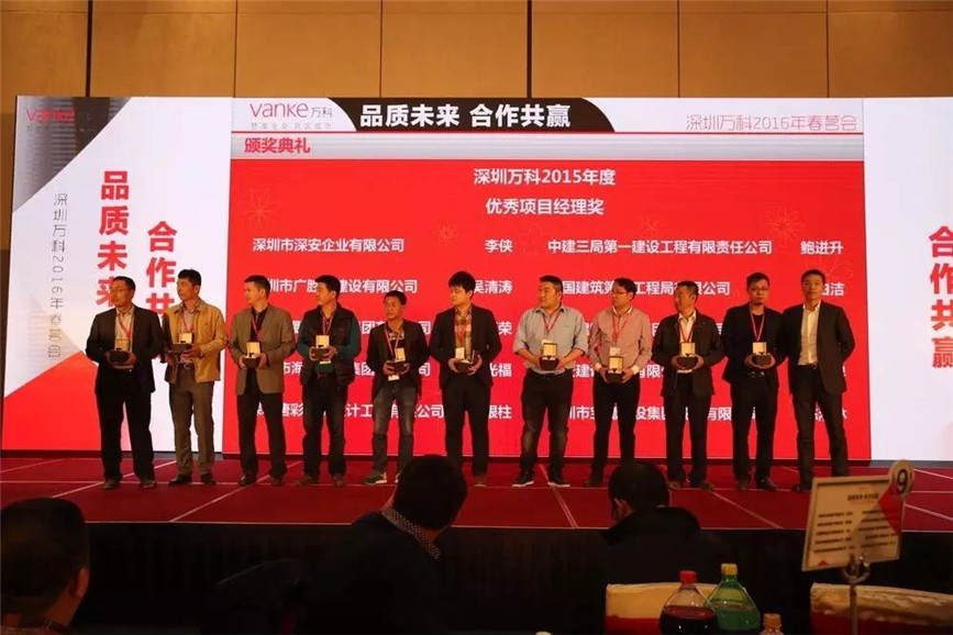 ▲寶鷹集團(tuán)項(xiàng)目經(jīng)理陳湘林獲得深圳萬(wàn)科2015年度優(yōu)秀項(xiàng)目經(jīng)理獎(jiǎng)(右二)