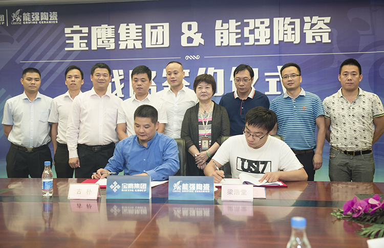 6月14日,廣東能強陶瓷有限公司與廣東道氏技術股份有限公司領導一行蒞臨寶鷹集團參觀考察。下午2時許,在寶鷹集團四樓大會議室,廣東能強陶瓷有限公司就原料利用與合作管理等多個方面與寶鷹集團展開商談并正式簽署戰略合作協議。該協議的簽訂標志著能強陶瓷正式成為寶鷹集團的戰略合作伙伴和原料供應商。