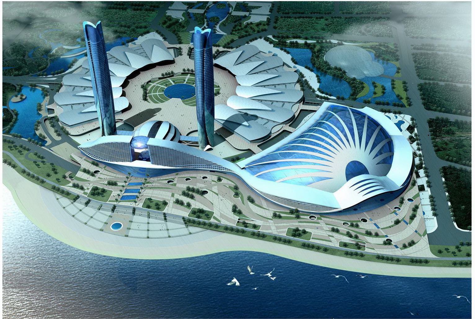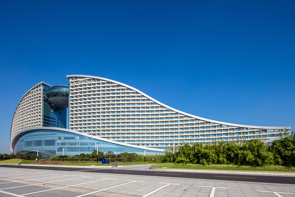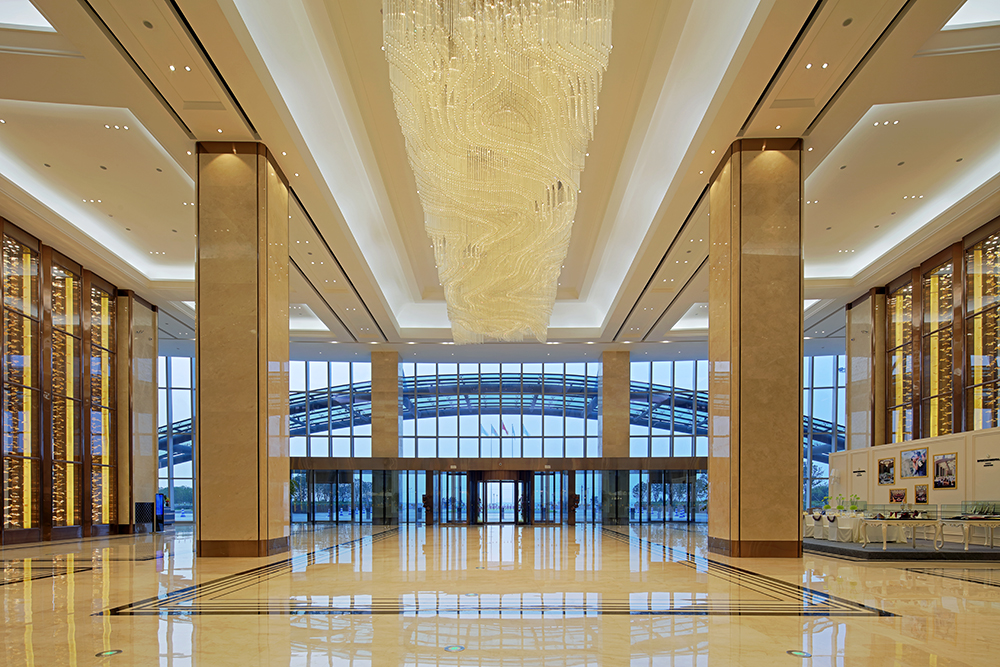國際會議中心與洲際酒店渾然一體,形似貝殼的仿生學(xué)設(shè)計極具視覺震撼力。位于國際會議中心頂層的空高16米、6,000平方米的無柱豪華宴會廳,是華中地區(qū)最大的宴會廳。