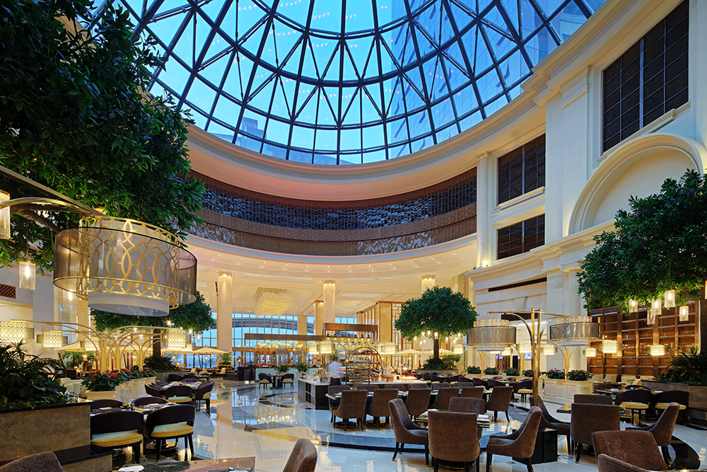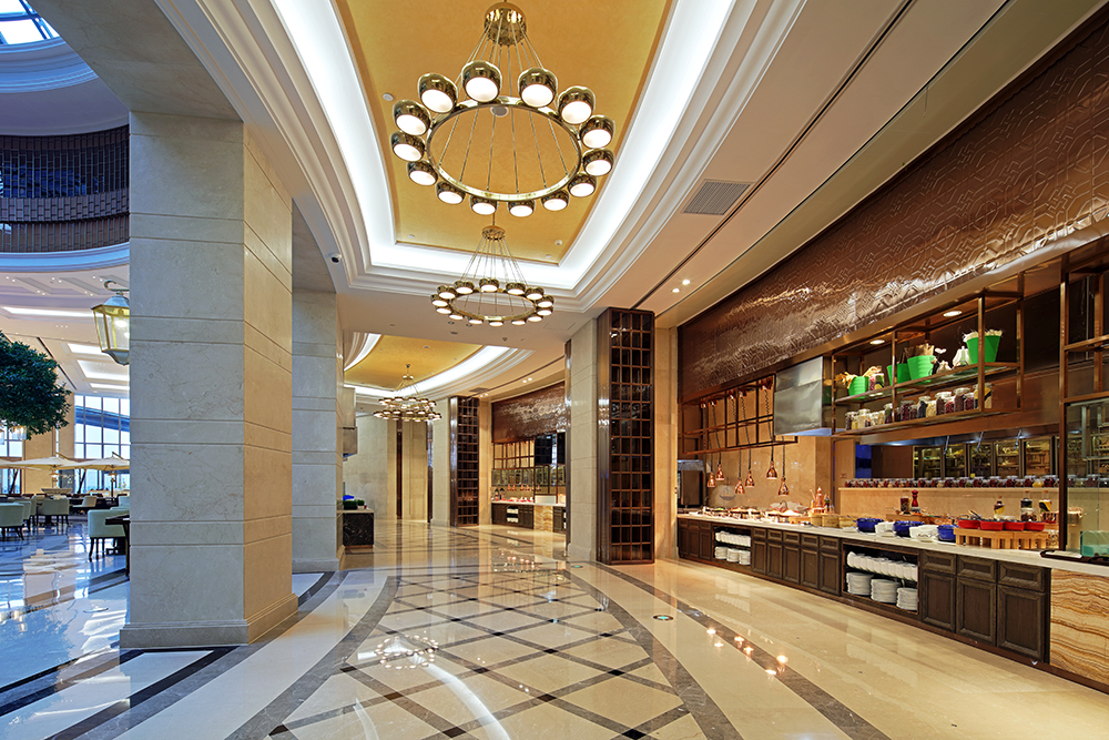 一層大堂,二層大堂、大堂吧簡潔大氣,四季廳歐式風(fēng)情濃郁,四層宴會廳和中餐區(qū)、健身中心也各有特色。在材質(zhì)上,寶鷹集團(tuán)大量使用高品質(zhì)石材,如廳柱、地面等,使得整體內(nèi)飾兼具實用性與觀賞性,既營造出國際會展酒店的商務(wù)風(fēng),又不失美學(xué)享受。