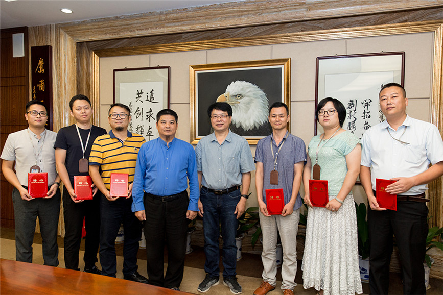 寶鷹集團副總裁古樸(左四)、廣西水利電力職業(yè)技術(shù)學(xué)院張忠海副院長(右四)與受聘為客座教授的六位寶鷹員工合影