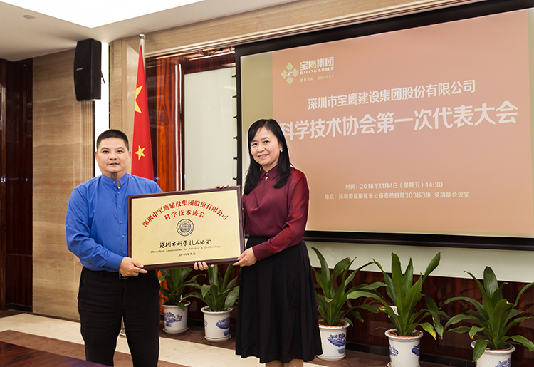深圳市科協(xié)黨組書記張莉向?qū)汑椉瘓F(tuán)授牌,寶鷹集團(tuán)副總裁、新當(dāng)選的寶鷹集團(tuán)科學(xué)技術(shù)協(xié)會常務(wù)副主席古樸代表協(xié)會接受牌匾