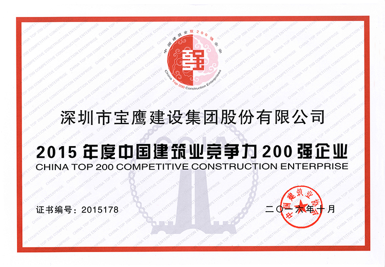 自2016年起,中國建筑行業(yè)協(xié)會將“中國建筑業(yè)雙百強(qiáng)企業(yè)評價”調(diào)整為“中國建筑業(yè)雙200強(qiáng)企業(yè)評價”(包括中國建筑業(yè)競爭力200強(qiáng)企業(yè)評價和中國建筑業(yè)成長性200強(qiáng)企業(yè)評價)。本次評選,寶鷹集團(tuán)在來自全國28個省、自治區(qū)、直轄市建筑業(yè)協(xié)會和16家行業(yè)建設(shè)協(xié)會以及中建總公司、中國建筑股份有限公司、中國新興總公司推薦的313家企業(yè)中成功突圍,榮膺“2015年度中國建筑業(yè)競爭力200強(qiáng)”榜單。
